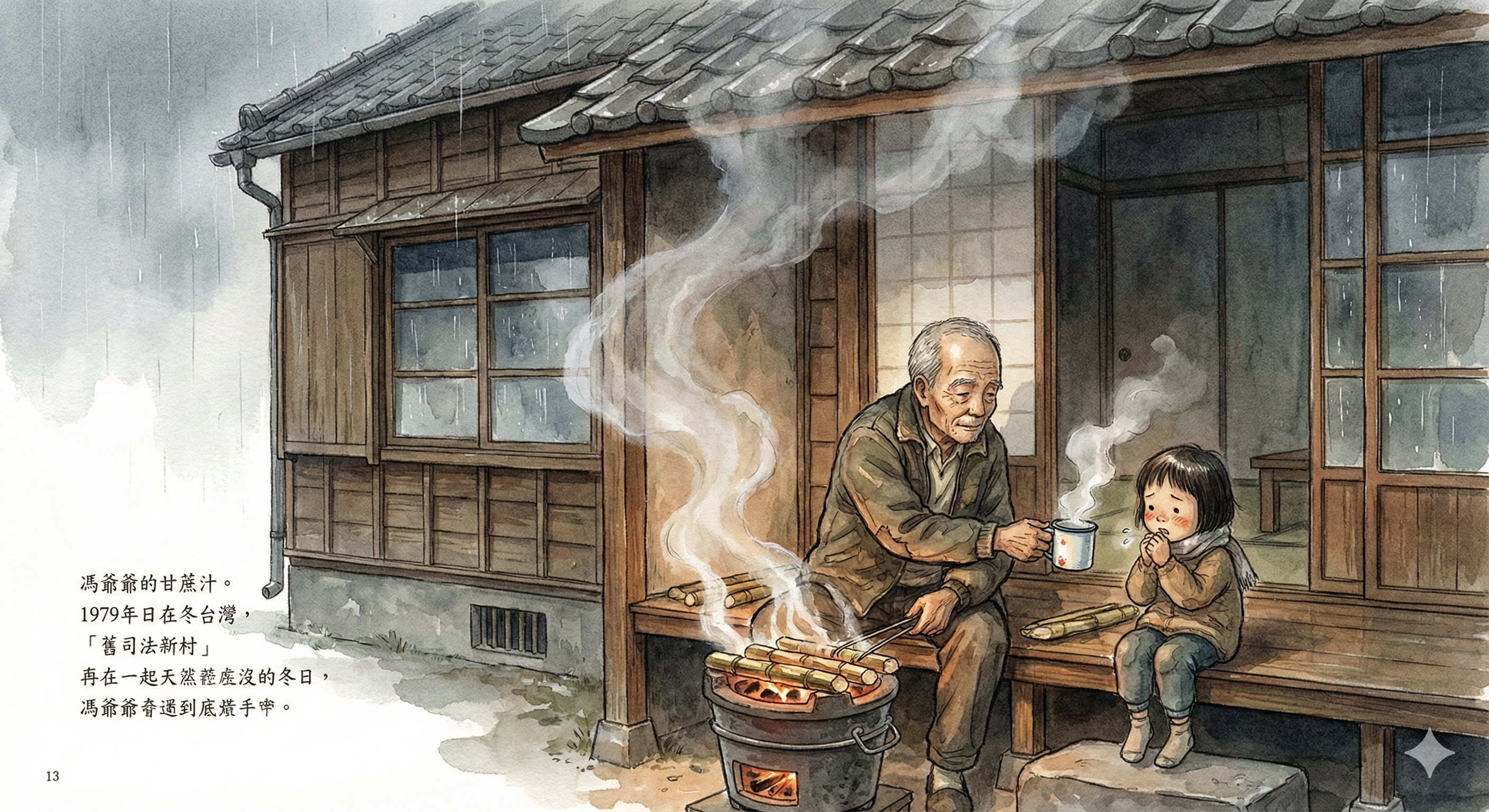 我探頭一看,是隔壁的馮爺爺。他已經過世很多年了,但那天的畫面,到現在還很清楚。他穿著一件舊外套,袖口磨得發亮,站在日式建築低矮的屋簷下,身旁擺著簡單的爐子,幾節甘蔗斜放在上頭。火不大,卻很穩。他沒有看我,只專心翻著甘蔗,像在照顧什麼脾氣古怪的老朋友。沒多久,他端著一個搪瓷杯走過來,裡頭冒著白煙。他把杯子遞給我,語氣很平淡,甚至有點生硬:「熱的,慢慢喝。」
