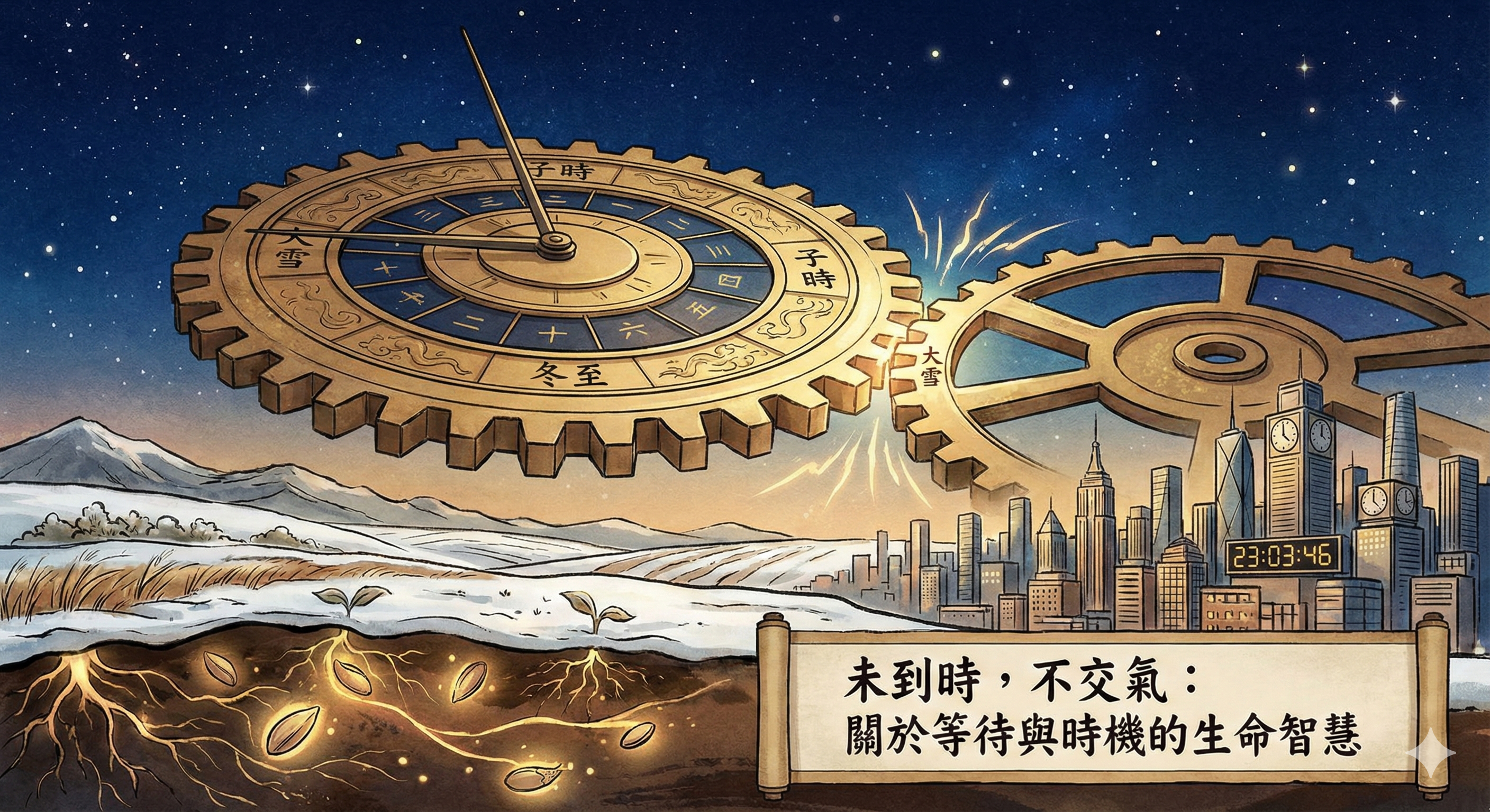 回到今晚的冬至。在23時03分47秒到來之前,這段時間絕非毫無意義的空白。它是「大雪」節氣能量累積至極致的過程,是陰氣盛極而衰、陽氣即將萌發的關鍵孕育期。沒有這段時間的極致沉澱,就沒有之後一陽初生的偉大轉折。