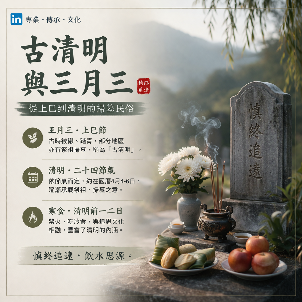因此,若說「以前掃墓是農曆三月三日,又稱古清明」,應當理解為:在部分地方、部分族群、尤其部分漳州移民傳統中,農曆三月初三的上巳節確實承擔了祭祖掃墓功能,故被視為古清明;但今日普遍所說的清明,則主要是依二十四節氣中的清明節氣而來。這樣說,既不抹煞民間記憶,也不混淆節氣與節日。